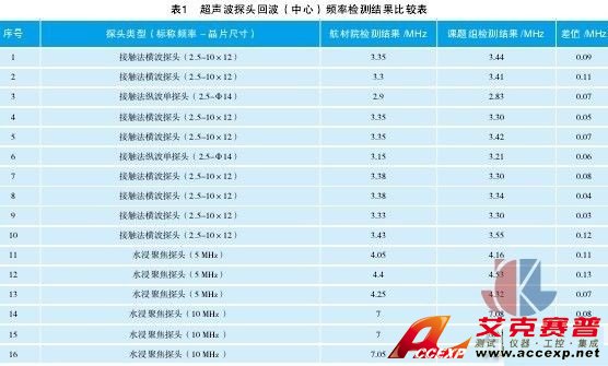 為了驗(yàn)證測試結(jié)果的正確性,采用本文中的裝置和方法對16個超聲波探頭回波頻率進(jìn)行測試,并與北京航空材料研究院無損檢測研究室探頭頻譜檢測結(jié)果進(jìn)行了比對,結(jié)果見表1??梢钥闯?,測試結(jié)果與航材院無損檢測研究室檢測結(jié)果具有很強(qiáng)的一致性,差值范圍在0.01MHz~0.13MHz之間。