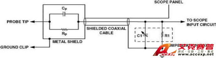 有些示波器探頭里沒有串聯(lián)的電阻,這類探頭主要就由一段電纜和一個測試頭構(gòu)成,因此,在其有用帶寬之內(nèi),探頭對信號沒有衰減作用。這類探頭稱為1:1或X1探頭。由于這類探頭在測試點(diǎn)處將其自身的電容(包括電纜的電容)與示波器的輸入阻抗連在了一起,所以這種探頭具有負(fù)載效應(yīng)。見圖2。