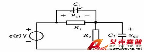 假設(shè)0時刻激勵源開始施加激勵,則會有一個階躍信號加在RC分壓電路上。將電路中的電壓源用短路代替后,電容C1和C2并聯(lián)等效于一個電容,說明該電路是一個一階電路。R1和R2并聯(lián)等效于一個電阻,