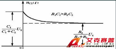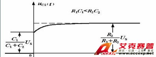 由上式子可以看出,輸出電壓的初始值由電容的比值確定,其穩(wěn)態(tài)分量由兩個電阻的比值確定,改變C1可以得到三種情況。當(dāng)R1*C1*<R2*C2時,輸出電壓的初始值比穩(wěn)態(tài)值小,瞬態(tài)分量不為零,輸出電壓由初始值逐漸增加到穩(wěn)態(tài)值,稱為欠補(bǔ)償: