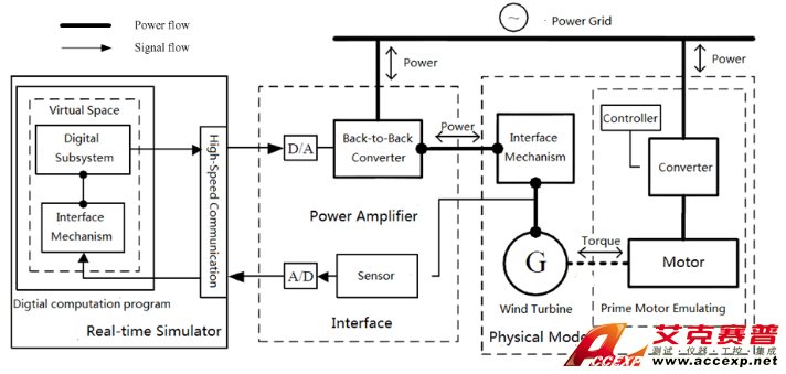 該項(xiàng)目是與清華大學(xué)電機(jī)系智能電網(wǎng)運(yùn)行與優(yōu)化實(shí)驗(yàn)室合作完成。目前風(fēng)電廠商較難設(shè)計(jì)出合適的控制器來滿足電力系統(tǒng)的實(shí)際需求;同樣電網(wǎng)公司也缺乏相應(yīng)的手段來測試含有功頻率控制的風(fēng)電機(jī)組和電力系統(tǒng)間的有功協(xié)調(diào)能力。為此設(shè)計(jì)基于實(shí)時(shí)仿真的功率硬件在環(huán)仿真測試平臺。通過電力系統(tǒng)實(shí)時(shí)仿真器模擬大電網(wǎng),雙饋風(fēng)電機(jī)組則用一套小功率的實(shí)際機(jī)組來模擬。平臺具體如下圖: