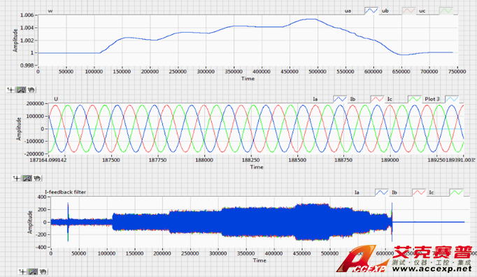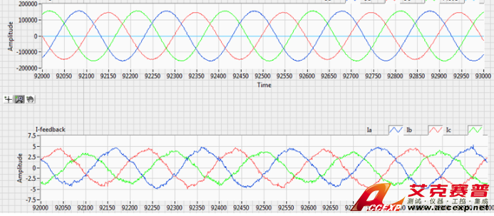 通過在實(shí)時(shí)仿真系統(tǒng)中設(shè)置不對稱故障從而在風(fēng)電機(jī)組接入點(diǎn)處產(chǎn)生不對稱電壓,來觀察風(fēng)電機(jī)組的運(yùn)行情況。下圖分別是實(shí)際風(fēng)電機(jī)組電壓接入點(diǎn)處的三相電壓和電流的波形圖:可以明顯看到有一相電壓幅值明顯低于其他兩相電壓。采樣的反饋電流也是三相不對稱,試驗(yàn)表明雙饋發(fā)電機(jī)組在三相不對稱電壓下仍然能正常工作。