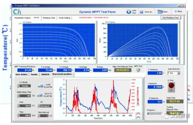 2. 軟件將記錄檔案讀入,設(shè)定太陽能電池特性及面積,即可仿真出變動的特性曲線。