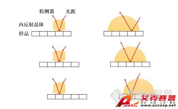 ATR模式包括ATR單點物鏡與ATR成像附件兩種測量方式。如圖2所示,如果使用ATR單點物鏡進行成像分析,每次只能測量與內反射晶體接觸的一個像素,然后使晶體與樣品脫離,移動樣品使內反射晶體接觸下一個像素并進行測量,直到獲得所有像素的光譜。很明顯的問題是,內反射晶體與樣品接觸后很容易被污染,影響后續(xù)像素測試結果的準確性,而且所有像素逐個測量的方式非常耗時。如果使用ATR成像附件,內反射晶體與所測樣品一起固定在樣品臺上,二者之間沒有相對位移,避免了晶體污染造成的測量誤差。樣品臺同步移動內反射晶體與所測樣品,改變紅外光束在內反射晶體上的入射位置,完成所有像素的測量。由于可以使用陣列檢測器,ATR成像的測試速度也非??臁5?,受到內反射晶體尺寸的影響,ATR成像的測試面積比較小(目前儀器上通常配備的反射晶體的直徑為500 mm,最大可以定制直徑為2 mm的晶體,但應同時考慮檢測器、軟件等因素)。此外,ATR單點物鏡與ATR成像附件有個共同的問題:該方法只能測量距離內反射晶體表面幾個微米深的樣品部分;在樣品表面與內部不一致時,該方法獲得的一般只是表面信息。