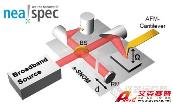 2013年,Neaspec公司推出了nano-FTIR光譜儀,利用其獨有的散射型近場光學技術發(fā)展出來的納米傅里葉變換紅外光譜技術,使得納米級化學鑒定和成像成為可能。nano-FTIR光譜儀的工作原理如圖3所示,將一束寬帶中紅外激光耦合進入近場顯微鏡(NeaSNOM),對原子力顯微鏡(AFM)針尖進行照明, 通過一套包含分束器、參考鏡和探測器在內的傅里葉變換光譜儀對反向散射光分析,即可獲得針尖下方20 nm區(qū)域內的紅外光譜,使得紅外光譜成像系統(tǒng)的的空間分辨率突破了微米的界限。該類型儀器綜合了AFM的高空間分辨率,和FTIR的高化學敏感度,實現了對有機、無機材料的納米級化學分辨。