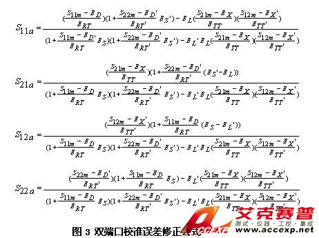 以上12項系統(tǒng)誤差,通過雙端口校準(zhǔn)可以獲得。校準(zhǔn)后,對被測件進(jìn)行測量,測量過程得到四個測量S參數(shù)S11m,S21m,S12m和S22m?;趫D3所示的四個雙端口誤差修正公式,消除12項系統(tǒng)誤差,最終計算出實際需要的被測件的四個S參數(shù)S11a,S21a,S12a和S22a。