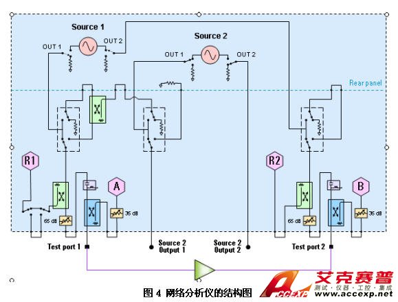 要想獲取高精度的測量結(jié)果,必須非常清楚地理解網(wǎng)絡(luò)分析儀的系統(tǒng)結(jié)構(gòu)。安捷倫最新的網(wǎng)絡(luò)分析儀PNA-X的系統(tǒng)結(jié)構(gòu)如圖4所示