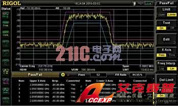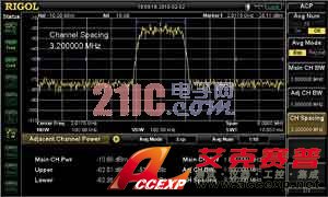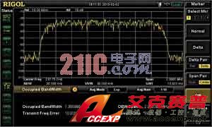 對于問題一和問題二可以采用DSA1030A頻譜分析儀中的ACP鄰道功率測量和OBW占用帶寬測量來解決。領(lǐng)道功率測量可以測量主道功率、前一信道和后一信道的功率、以及主道與上下鄰道之間的信噪比測量,圖1中左下方為測量結(jié)果。用戶根據(jù)特定的需要靈活設(shè)置主道帶寬、鄰道帶寬以及主道和鄰道之間的間距的大小,圖1中右下方為測量設(shè)置值。通過利用領(lǐng)道功率測量的功能可以清楚地測出通道通信的能量大小以及通信的信噪比。從圖1可以得出主道能量為-10.69dBm且基本上集中在1.6MHz的帶寬內(nèi),符合TD-SCDMA信號每個載波的帶寬為1.6MHz的要求。鄰道抑制為-51.32d和-51.66dB,可以滿足一般的需要B和-51.66dB,可以滿足一般的需要。