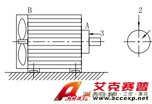 測振過程中,測點(diǎn)的選擇直接影響監(jiān)測結(jié)果,測點(diǎn)的選擇原則是:1、要盡量靠近振源;2、要盡量對準(zhǔn)振動(dòng)方向 3、便于多方位測量。例如,對旋轉(zhuǎn)機(jī)械而言,測點(diǎn)應(yīng)盡量靠近軸承。電機(jī)自由端一般有后風(fēng)扇罩,其測點(diǎn)選擇在風(fēng)扇罩固定螺絲有較好監(jiān)測效果,由于軸承振動(dòng)的方向是不確定的,通??扇≥S向和徑向;如圖 3 所示,三個(gè)方向(軸向、垂直徑向、水平徑向)可確定測點(diǎn)的振動(dòng)情況:A 點(diǎn)測三個(gè)方向,B 點(diǎn)只能測二個(gè)方向,但軸向振動(dòng)的好壞可從 A 點(diǎn)反映出來。