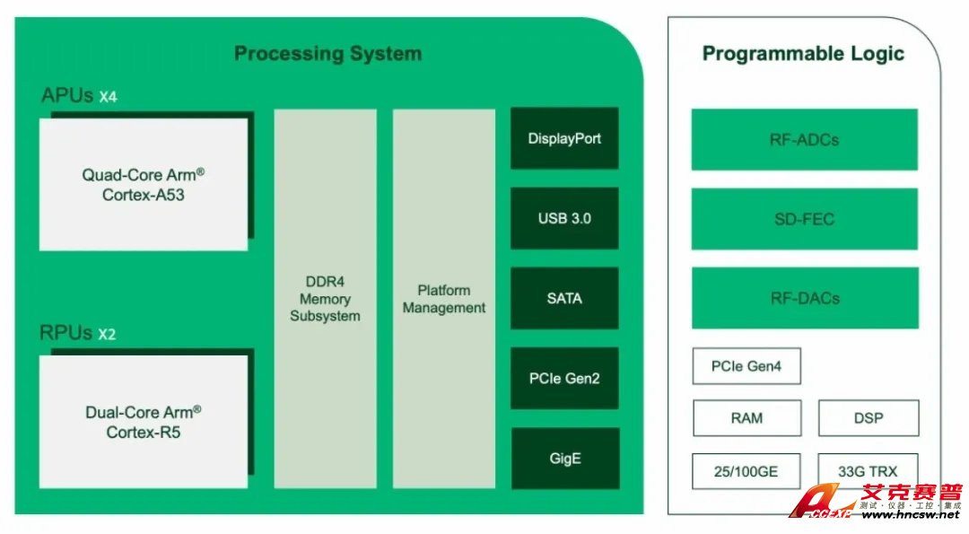 除了系統(tǒng)的 FPGA 架構(gòu)部分,Xilinx UltraScale+ RFSoC 還配備了四個(gè)板載應(yīng)用處理單元 (APU) 和兩個(gè)實(shí)時(shí)處理單元 (RPU),適用于需要板載嵌入式操作系統(tǒng)進(jìn)行獨(dú)立操作的應(yīng)用。