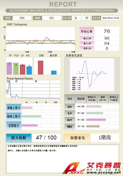 Max Pulse精神壓力分析儀根據(jù)The Task Force組織建議的理論標(biāo)準(zhǔn)為基礎(chǔ),全世界首次具備了符合東方人生理范圍的參考常模,是由韓國MEDICORE公司研發(fā)生產(chǎn)的、全世界首次定量化分析人體精神壓力、軀體壓力的高科技產(chǎn)品。   HRV檢測是基于正常節(jié)律(Sinus Rhythm)為分析對象,因此采集信號的準(zhǔn)確性尤為重要。HRV是世界范圍內(nèi)廣泛研究的理論,是一種值得信賴的檢測工具。