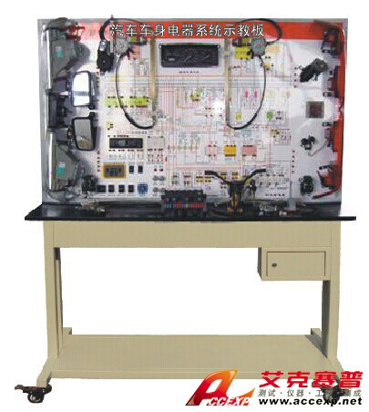 桑塔納2000起動系統、電源系統、儀表系統、燈光照明系統、中控門鎖、電動門窗、音響系統、雨刮系統及各類開關等。檢測端子、故障設置系統、大容量蓄電池或12V開關電源、大型彩色噴繪電路原理圖、控制面板、可移動臺架、使用說明書及實訓指導書等。