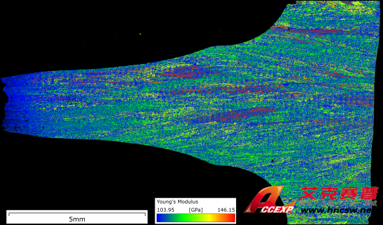 該面分布圖顯示了來自大型力學(xué)測試的Ti64合金樣品的EBSD數(shù)據(jù),晶粒取向數(shù)據(jù)用于計(jì)算加載方向的楊氏模量