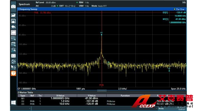 R&S FPL1000 可與高級別分析儀相提并論,它在 10 kHz 偏置(1 GHz 載波)時的相位噪聲典型值為 –108 dBc (1 Hz),三階互調截取點典型值為 +20 dBm,分辨率帶寬為 1 Hz 至 10 MHz,顯示平均噪聲電平典型值為 –163 dBm。因此,它非常適合在實驗室、生產(chǎn)以及維修任務中使用。