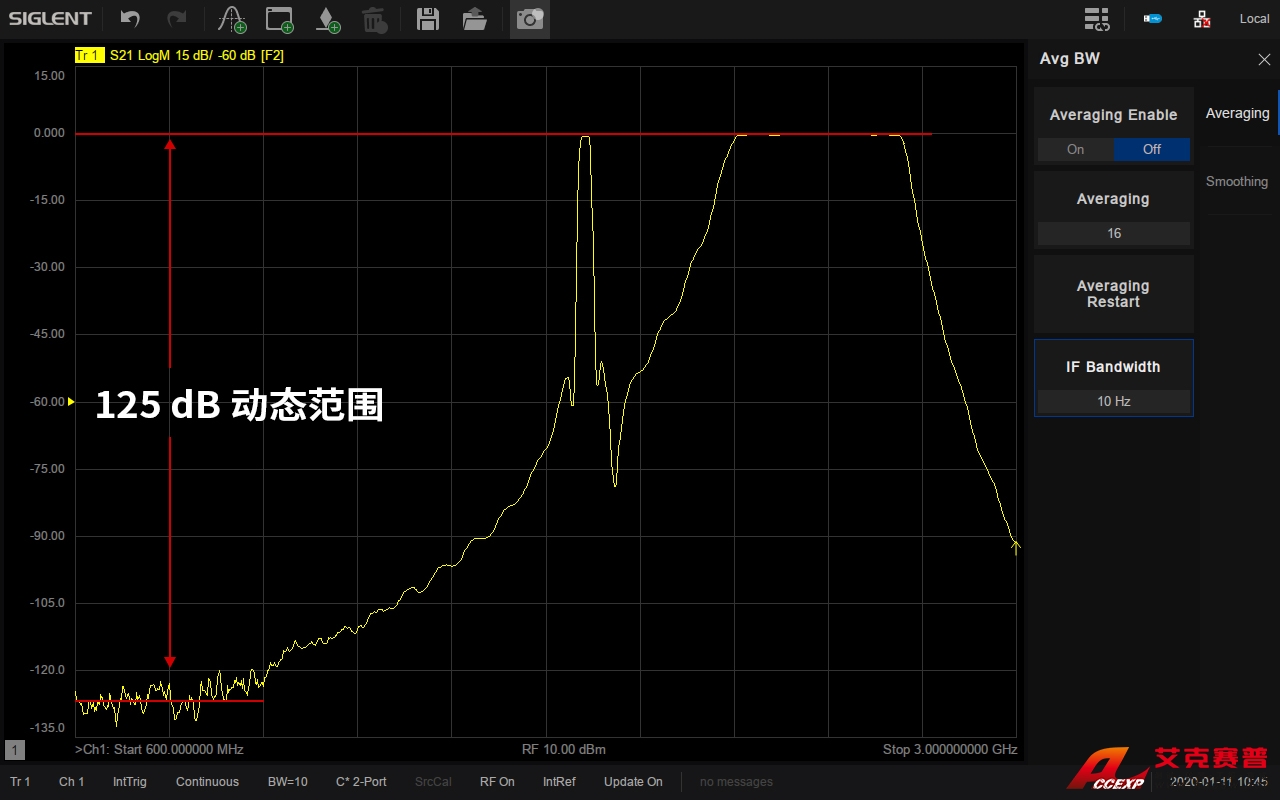 簡介:低噪聲,高動態(tài)范圍系統(tǒng)動態(tài)范圍是VNA一個非常重要的指標(biāo),它是VNA源的最大輸出功率與測試端口本底噪聲的差值。SNA5032A 擁有最大125 dB的動態(tài)范圍,可適用于對動態(tài)范圍要求比較高的測試場景,比如同時測量濾波器的通帶和帶外抑制性能。...